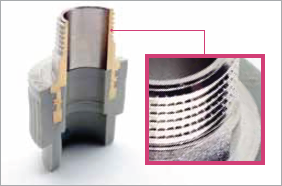 Liên kết giữa vật liệu PP-R và phần ren bằng kim loại là yếu tố rất quan trọng đối với sự an toàn của hệ thống, lực từ bên ngoài có thể tác động vào hệ thống khi phần răng bị xiết chặt. Bộ phận sườn kim loại của phụ kiện REHAU RAUFUSION với thiết kế sâu đa điểm ngậm sâu vào phần thân nhựa đã được thử nghiệm nghiêm ngặt đảm bảo khả năng chống lại các momen xoắn cực trong khi lắp đặt. Ngoài ra, các răng cưa đảm bảo băng teflon được gắn chặt xung quanh ren, mang lại sự an toàn tối đa.